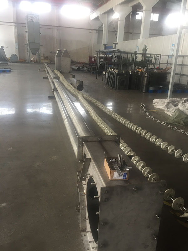 管鏈輸送機是輸送粉狀、小顆粒狀及小塊狀等散狀物料的連續(xù)輸送設(shè)備,可以水平、傾斜和垂直組合輸送。在密閉管道內(nèi),以鏈片為傳動構(gòu)件帶動物料沿管道運動。當水平輸送時,物料顆粒受到鏈片在運動方向的推力。當料層間的內(nèi)摩擦力大于物料與管壁的外摩擦力時,物料就隨鏈片向前運動,形成穩(wěn)定的料流;當垂直輸送時,管內(nèi)物料顆粒受鏈片向上推力,因為下部給料阻止上部物料下滑,產(chǎn)生了橫向側(cè)壓力,所以增強了物料的內(nèi)摩擦力,當物料間的內(nèi)摩擦力大于物料與管內(nèi)壁外摩擦力及物料自重時,物料就隨鏈片向上輸送,形成連續(xù)料流。